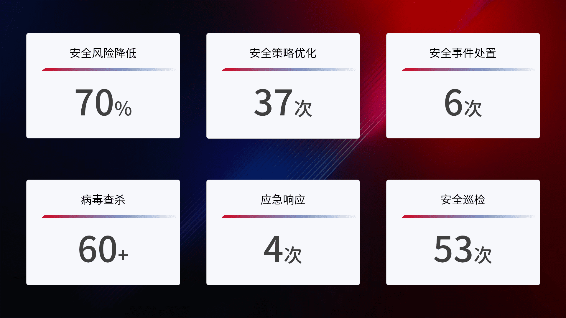 提供全面的安全事件报告体系,,,包括处置报告、、、、周报、、、季度和年度总结,,,,结合持续监控,,,,帮助客户深入了解网络安全状况。。。