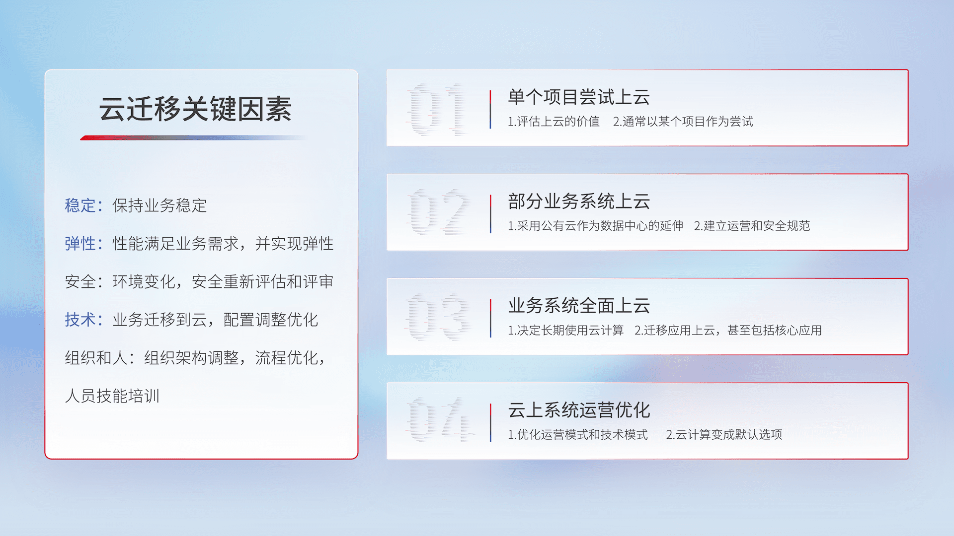 结合实际业务,,,,从规划设计、、、、云平台选型、、、云原生改造、、、、数据迁移、、集成交付,,,,迁移全过程为客户识别最佳上云路径,,做好风险识别管理,,设计网络架构、、身份权限、、、安全审计合规、、、操作审计、、、、日志审计、、、监控告警策略、、、多站点容灾设计等,,,对云上基础设施进行整体规划,,提升IT治理水平,,以满足弹性、、高可用、、高性能的需求。。
