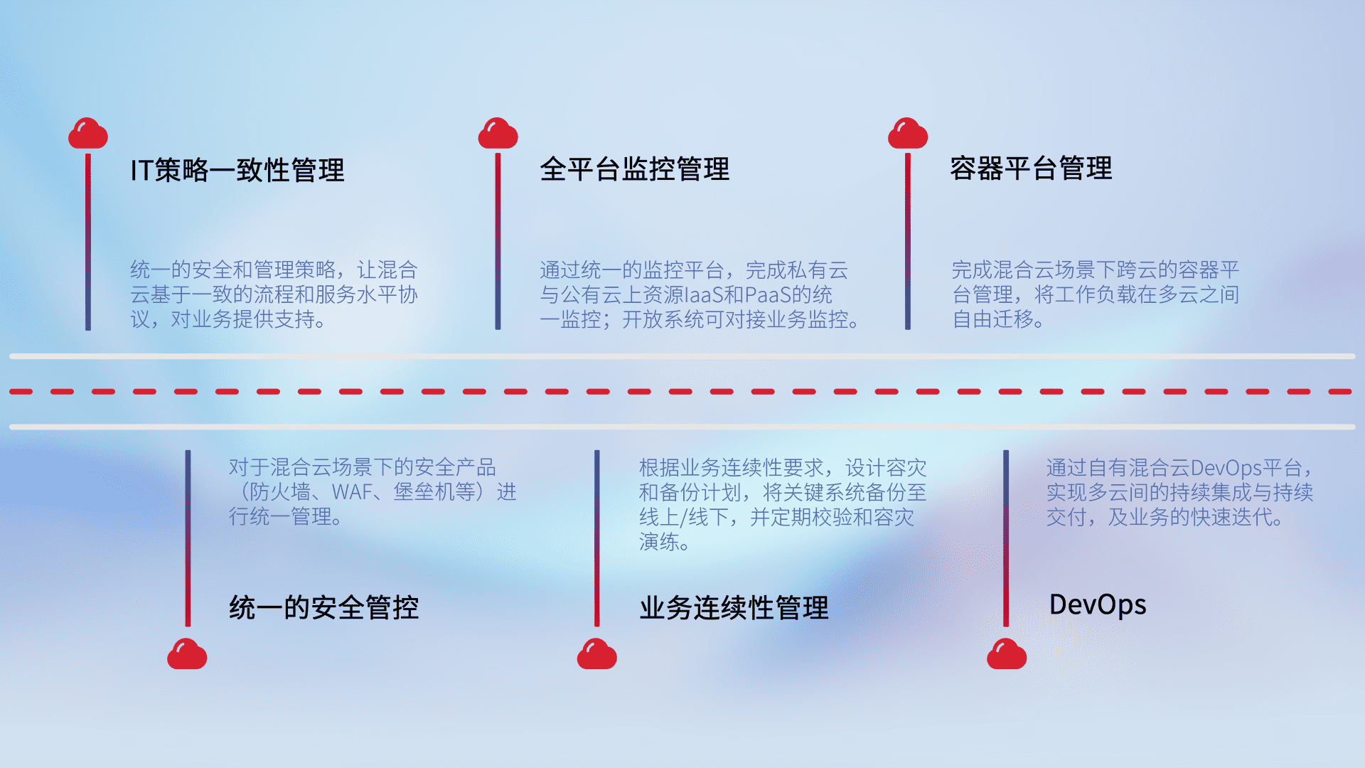 通过多云纳管,,以统一的资源数据模型把客户的云资源进行抽象和封装,,,,进而实现对多云资源的统一操作,,保障云资源管理的可靠性、、、、稳定性与可用性。。。。量身定制化运维内容,,,配置、、、、开发运维、、、补丁管理、、、备份、、监控、、认证和访问管理、、、、审计和日常巡检等,,,,保障在用云过程中的可靠度,,,,稳定度以及高可用率。。。。