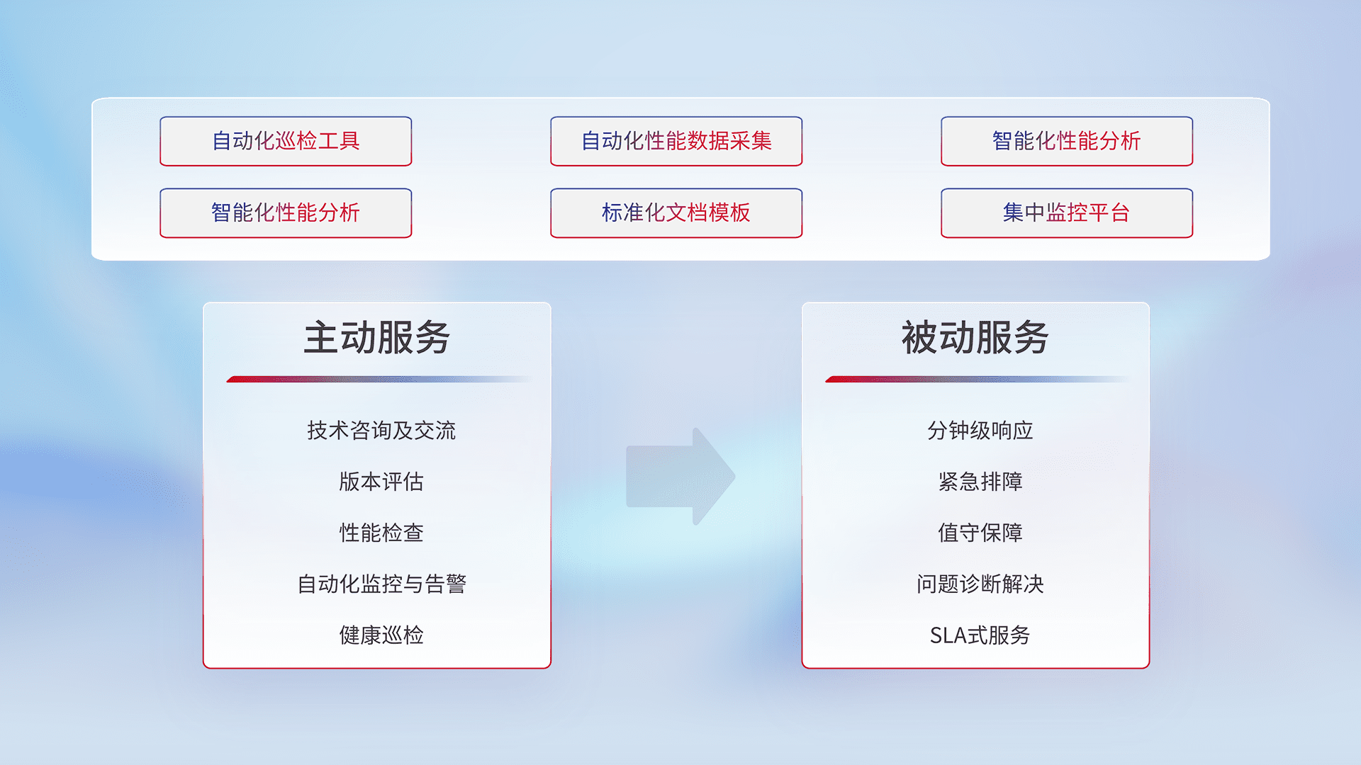 智能化工具和标准化文档,,保障服务质量,,,,提供主动服务(包含技术咨询、、、、版本评估、、性能检查、、自动化监控与告警、、、、健康巡检)和被动服务包含(分钟级响应、、、紧急排障、、值守保障、、、问题诊断解决、、、、SLA服务)。。